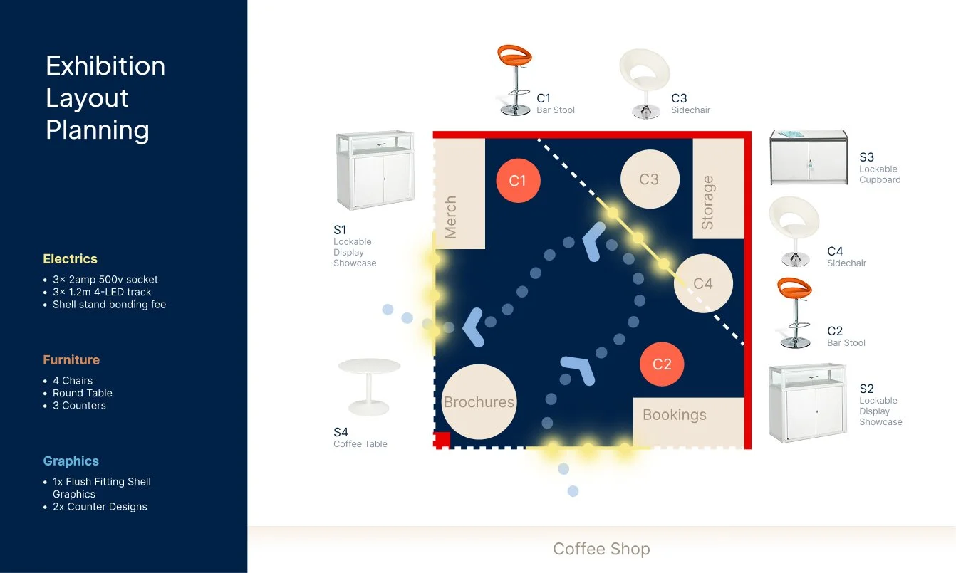 Design and planning of the exhibition shell, integrating graphics, furniture, and vendor coordination