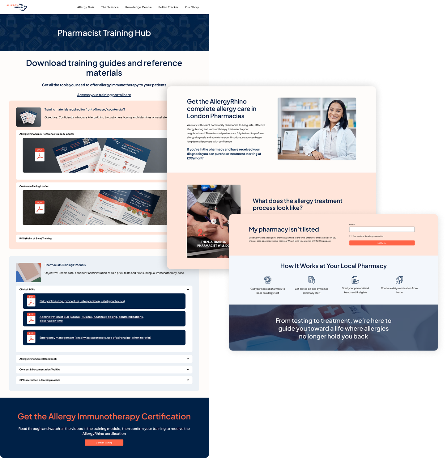 The solution was designed as a vertically integrated, digital first allergy care service. I built a complete system that combined digital diagnosis and treatment management, the development of an own brand immunotherapy product to reduce cost, and physical access through a pharmacy pilot. This allowed patients to access care digitally, receive medication at home, or visit partner pharmacies for in person testing and prescriptions.
